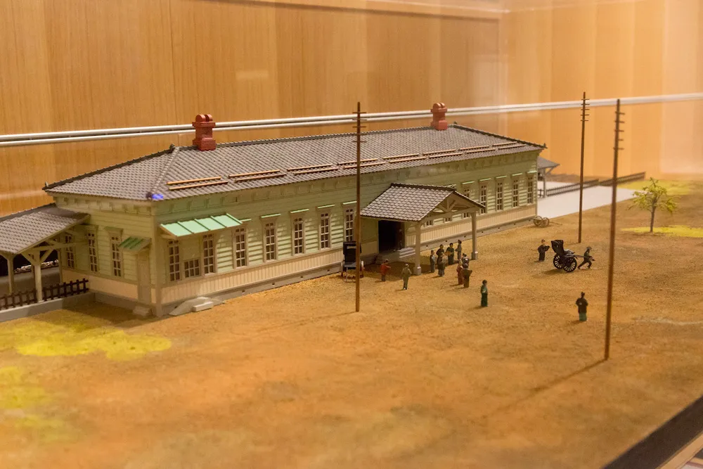 石川県立博物館に展示してあった当時の金沢駅のモデルにもその広見と駅のモデル、そして駅の間取りも展示されていたのでここで紹介しておく。先に紹介した駅の写真は白黒写真で駅の色がわからなかったが駅は薄い緑色だったようだ。屋根の煙突のような部分は赤色。かわいい明治の駅だったのだ。